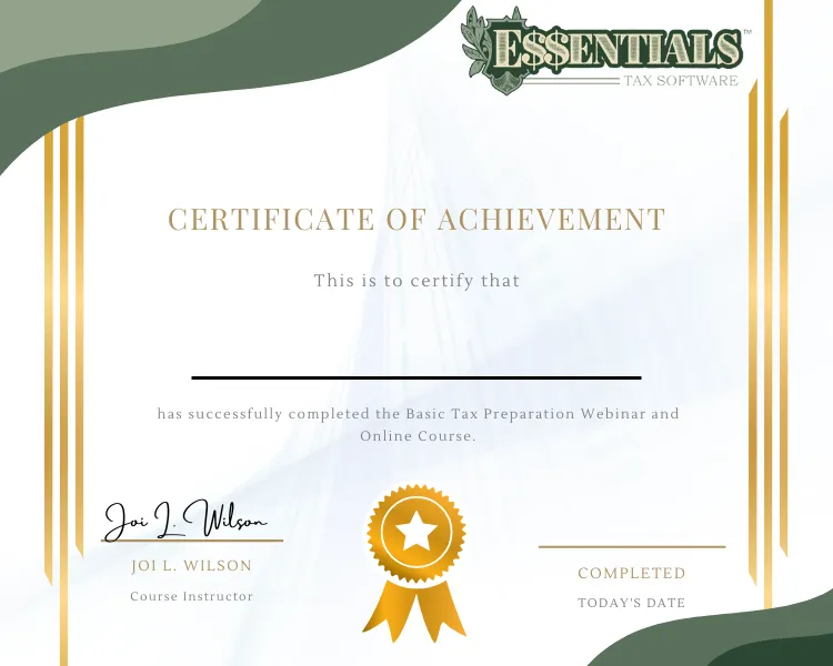 Through clear instruction, real-life examples, and step-by-step guidance, the instructor empowers students to master both tax preparation concepts and the use of Essentials Tax Software—ensuring they are fully equipped to serve clients professionally and grow their tax businesses successfully.
